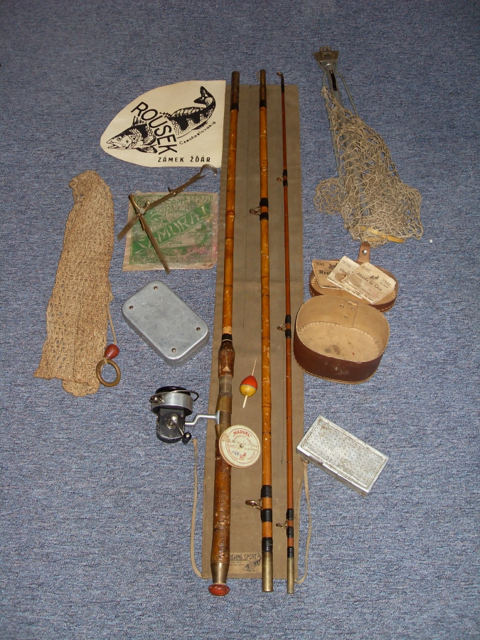 Rybaření s historickým nářadím do roku 1948:Antik Rolle und Rute,Old reels and rods.